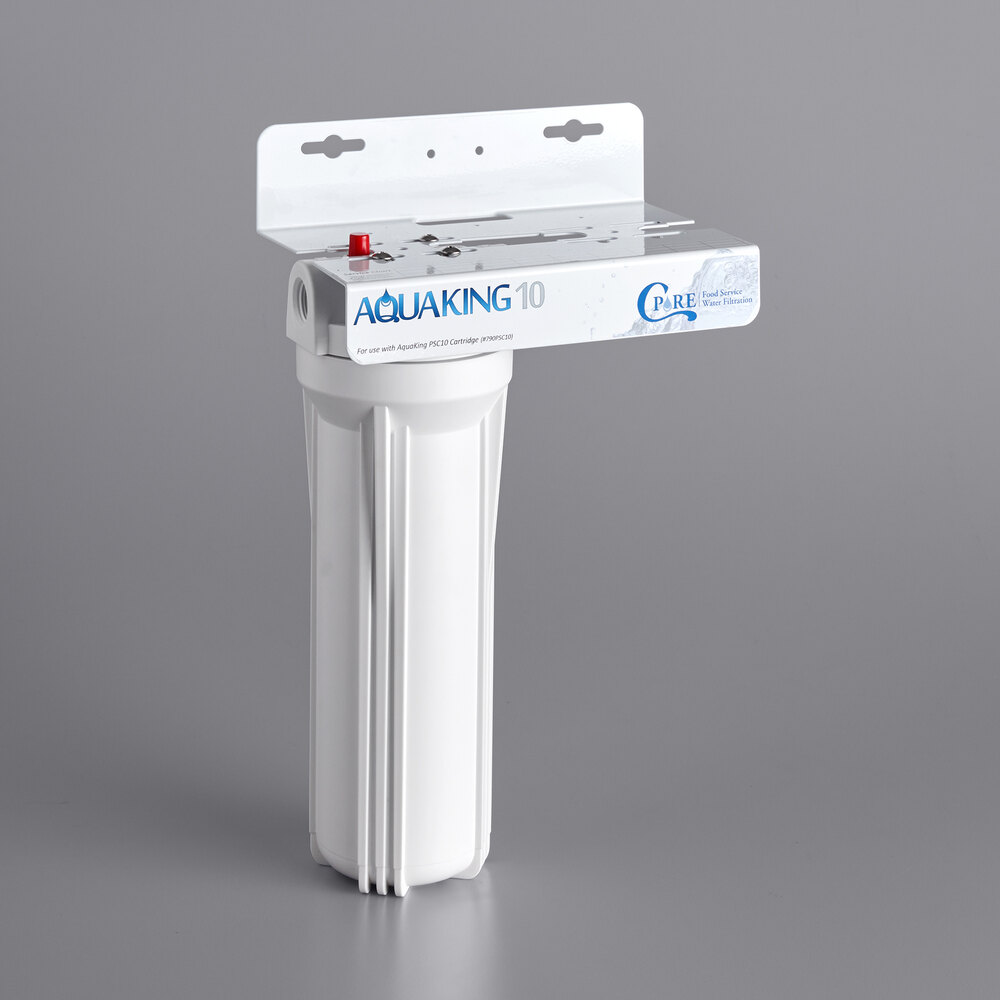 Provide your customers with the cleanest and most refreshing ice possible while prolonging the life of your ice machine and reducing costly maintenance by using this C Pure AQUAKING10 10" single cartridge water filtration system! This system's 10" white housing has a convenient pressure relief button and safely holds the included 9 3/4" anti-scaling phosphate drop in cartridge. The cartridge boasts 4 oz. of crystalline polyphosphate that combines with premium granular activated carbon to prevent harmful scale buildup on pipes, evaporator plates and other components while also eliminating unappealing chlorine tastes and odors.